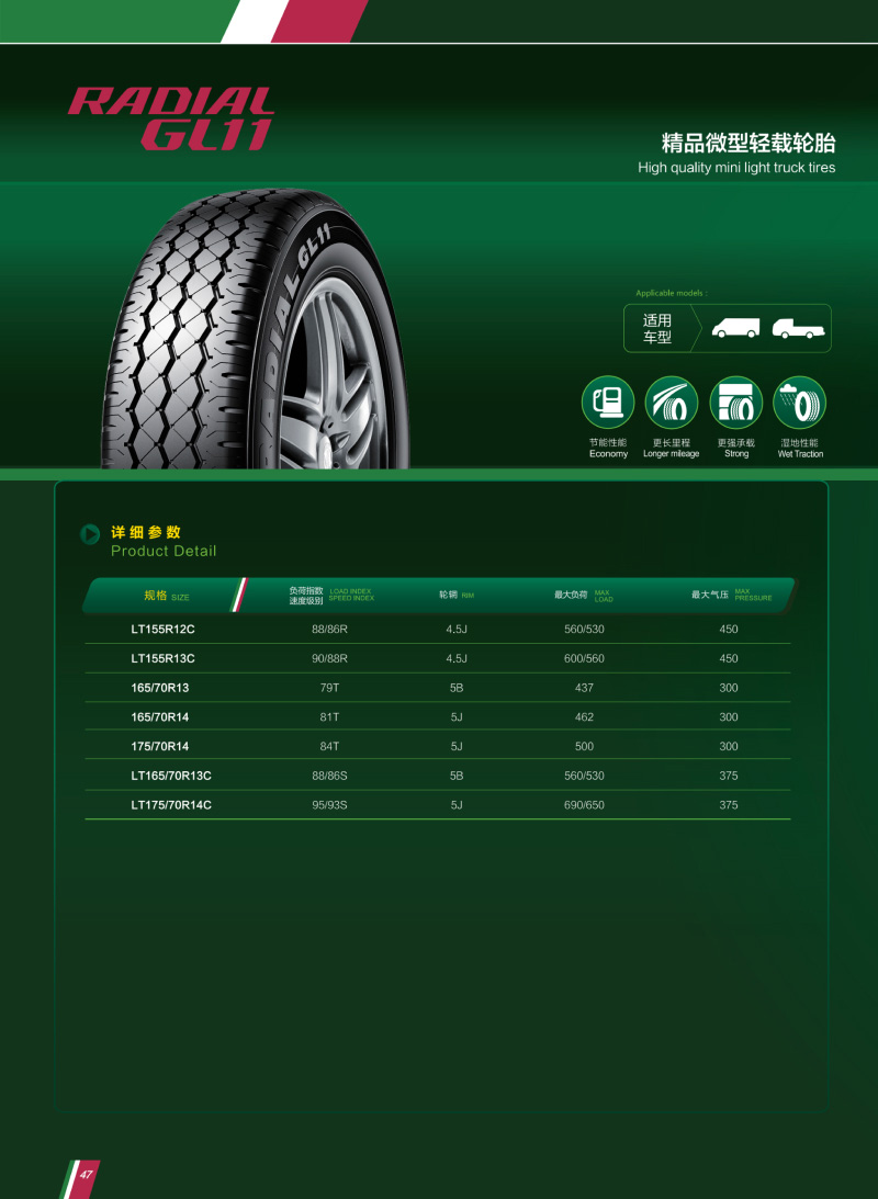 精品轻载轮胎,高强胎体结构,承载力更强,耐磨橡胶配方和加深花纹,更高的使用寿命。