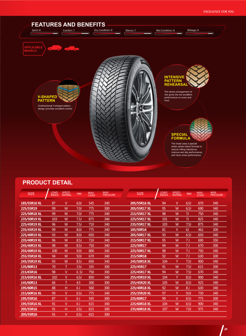 高性能全季节轮胎,全新配方、单导向人字形花纹设计,操控性优秀,雪泥地性能优越,是一款综合性极强的四季轮胎。