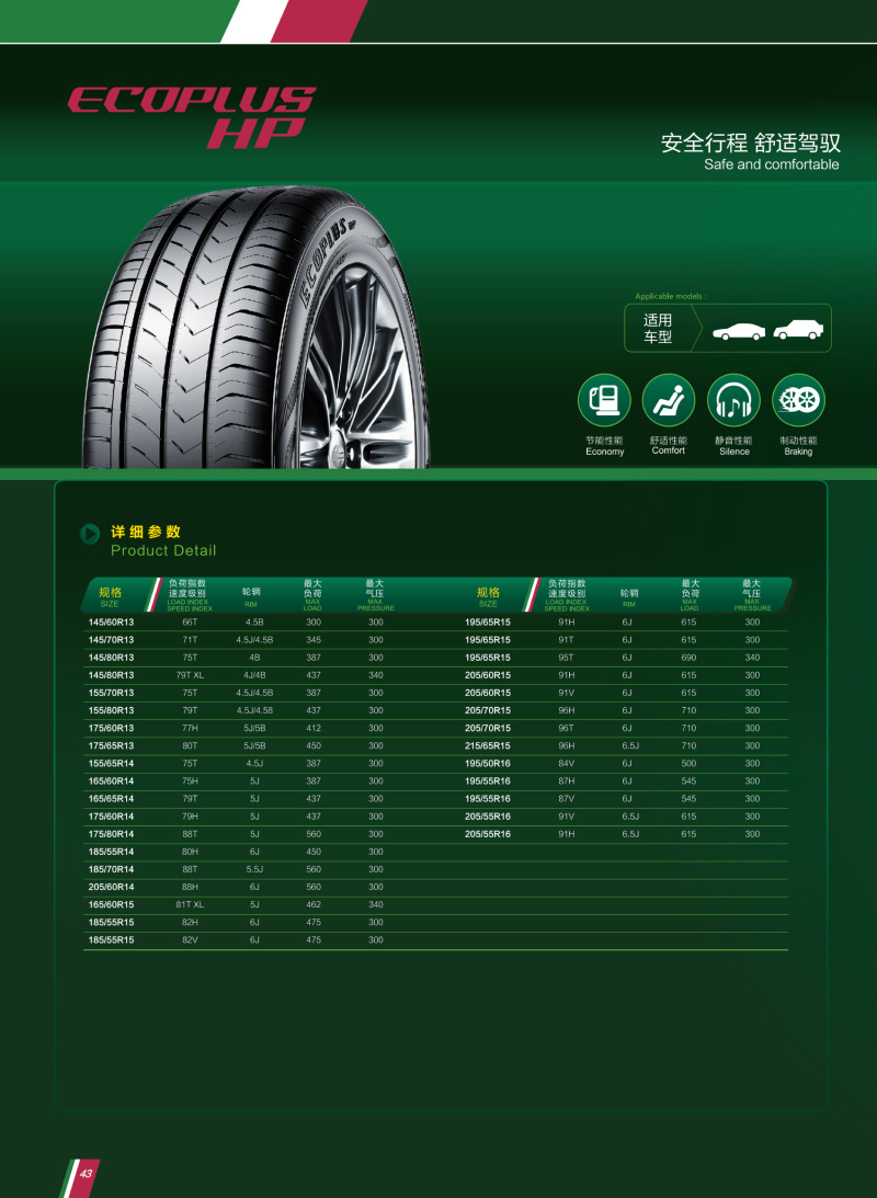 ECOPLUS HP 静音舒适,降低行驶中的噪音产生。节油环保,降低滚动阻力。