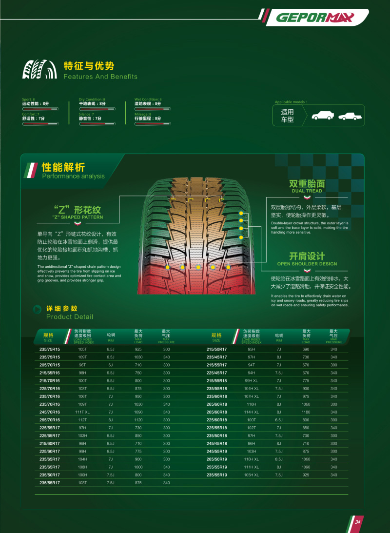 创新双重胎面设计,有效防止轮胎在冰雪地面上侧滑,提供最优化的轮胎接地面积和抓地沟槽、抓地力更强。