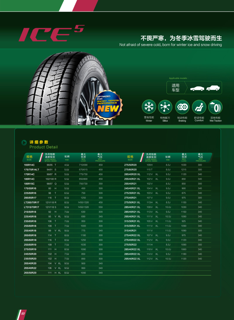 全新花纹和耐寒配方,为冬季冰雪驾驶而生,在冰雪路况下提供更有效的行驶和转弯稳定性,并可适用于新能源汽车。