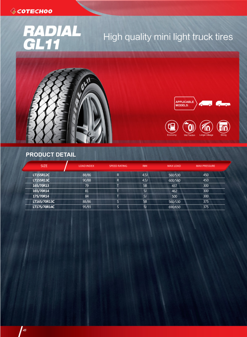 精品轻载轮胎,高强胎体结构,承载力更强,耐磨橡胶配方和加深花纹,更高的使用寿命。