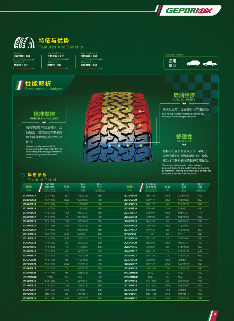 独特花纹设计,在非铺装路面上具有超强的耐用性和抓地力,是一款适用各种路况的越野专用轮胎。